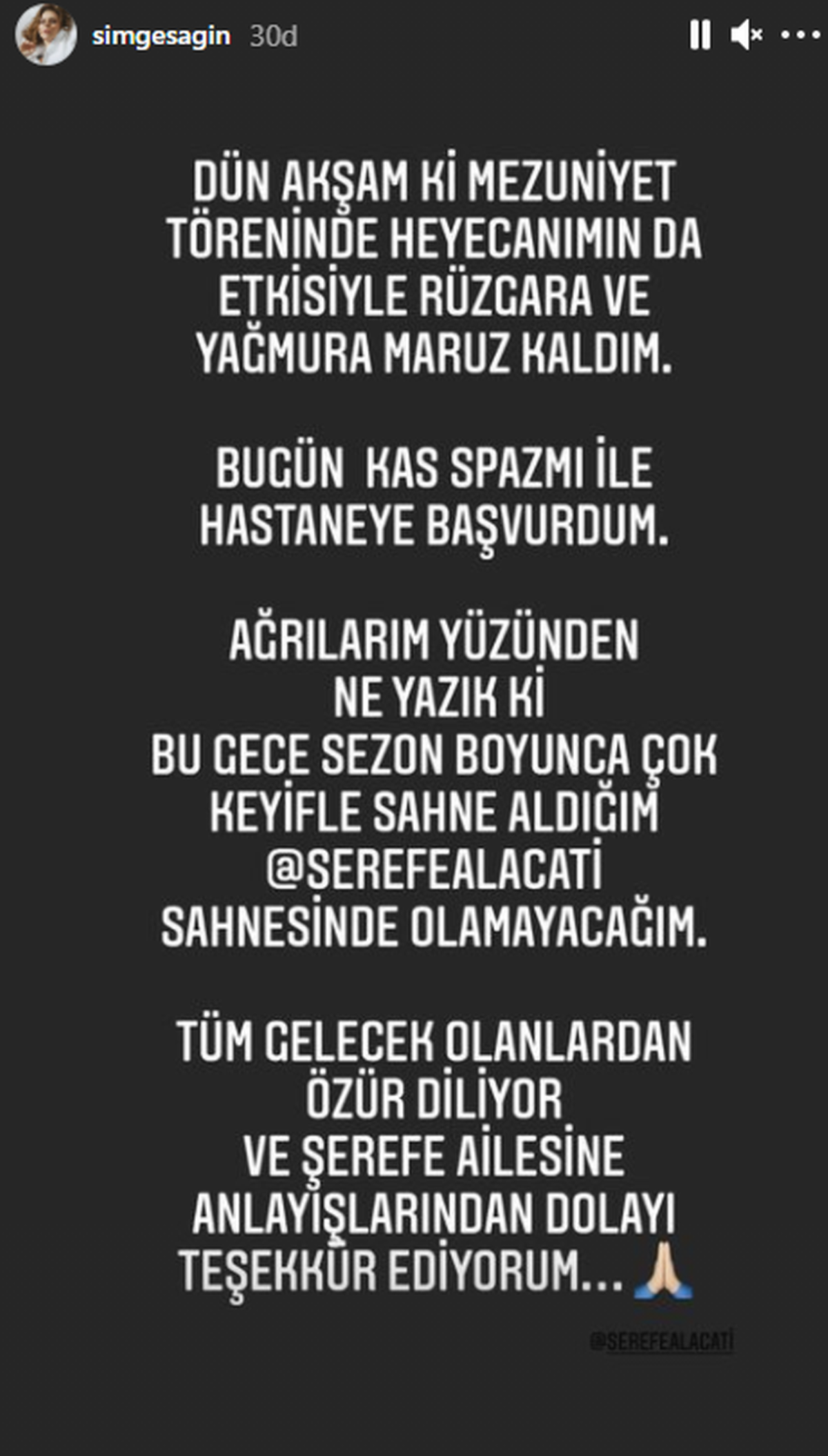 Sosyal medya sayfasından bir paylaşım yapan ve hastaneden bir görüntü yayınlayan Simge Sağın, durmunu şöyle açıkladı: “Dün akşamki mezuniyet töreninde heyecanımda rüzgâra ve yağmura maruz kaldım. Bugün kas spazmı ile hastaneye başvurdum. Ağrılarım yüzünden ne yazık ki bu gece sezon boyunca sahne aldığım mekânda olamayacağım. Tüm gelecek olanlardan özür diliyorum”