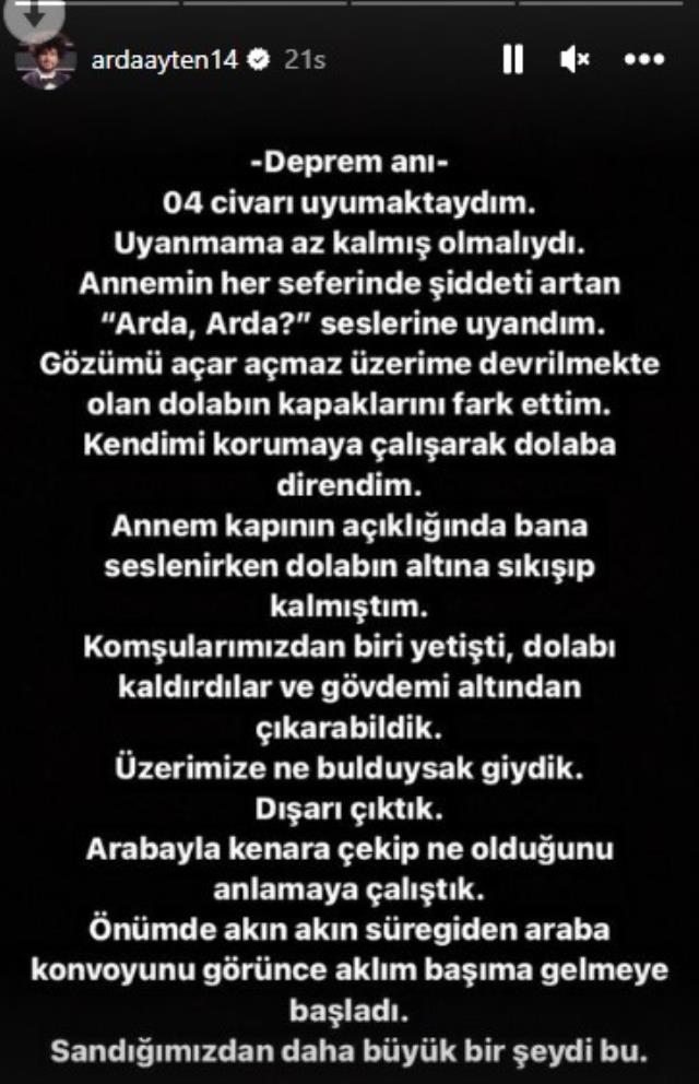 Kim Milyoner Olmak İster izleyicilerinin yakından tanıdığı Arda Ayten İskenderun’da yaşadığı acı dolu deprem anlarını anlattı.2019 yılında ATV’nin fenomen programı Kim milyoner olmak ister’den en büyük ödül olan 1 milyon TL’yi kazanan Tıp Fakültesi öğrencisi Arda Ayten deprem esnasında ve sonrasında yaşadıklarını sosyal medya üzerinden paylaştı;"Deprem anı... 04.00 civarı uyumaktaydım.Uyanmama az kalmış olmalıydı.Annemin her seferinde şiddeti artan 'Arda, Arda?' seslerine uyandım.Sandığımızdan daha büyük bir şeydi bu."