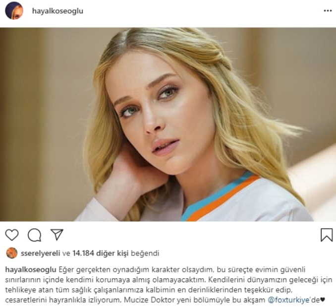 Koronavirüs sebebiyle birçok set de çekimlerine ara verdi. Tehlikeli bir salgın mücadele edilen bugünlerde evde kalma hayati bir öneme sahip. Mucize Doktor'un hemşiresi Hayal Köseoğlu da kendini evinde karantinaya alan isimlerden. Evinde karantinada olan Köseoğlu, intagram hesabından yaptığı paylaşımda gerçekten oynadığı karakter olsaydı kendini evinde karantinaya alamayacağını belirterek, sağlık çalışanlarına teşekkür etti. Köseoğlu, kendilerini dünyamızın geleceği için tehlikeye atan sağlık çalışanlarının cesaretini hayranlıkla izlediğini söyledi. Rolü ile gerçek arasında bağlantı kuran güzel oyuncu Hayal Köseoğlu'nun karantina sürecinde yaşadığı duygusal derinlik de paylaştığı mesajla ortaya çıktı.