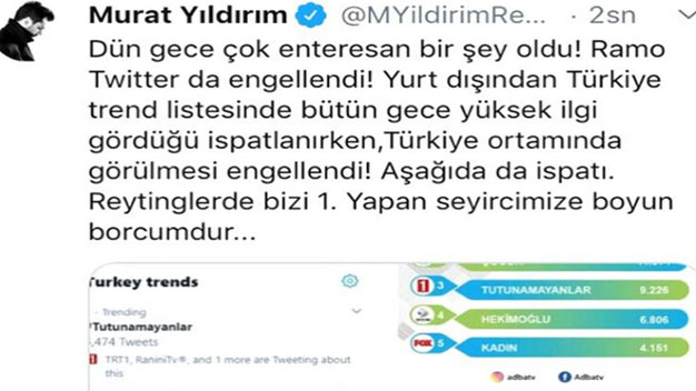Başrollerinde Murat Yıldırım ve Esra Bilgiç’in rol aldığı ilk iki bölümü ekrana gelen ve BKM yapımı Ramo seyirci tarafından sevilmiş durumda. Reytingleri oldukça iyi olan dizi ayrıca sosyal medyada da kendisini sıklıkla yer bulma başardı. Ancak Salı akşamı ikinci bölümüyle ekrana gelen dizinin yeni bölümünün yayını sırasında oyuncu Murat Yıldırım sosyal medya hesabından bir paylaşımda bulundu. Oyuncu oldukça ses getiren bir iddiayı dillendirdi. Murat Yıldırım açıklamalarında “Dün gece çok enteresan bir şey oldu! Ramo Twitter’da engellendi. Yurt dışından Türkiye trend listesinde bütün gece yüksek ilgi gördüğü ispatlanırken, Türkiye ortamında görülmesi engellendi! Aşağıda da ispatı. Reytinglerde bizi birinci yapan seyircimize boyun borcumdur…” ifadelerini kullandı.