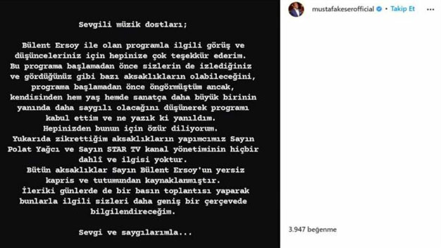 Benzemez Kimse Bize adlı programın yayından kaldırılmasıyla program sunucularından Mustafa Keser diğer sunucu Bülent Ersoy’u suçladı. Mustafa Keser sosyal medya hesabından yaptığı paylaşımda “ Sevgili Müzik dostları; Bülent Ersoy ile olan programla ilgili görüş ve düşünceleriniz için hepinize çok teşekkür ederim. Bu programa başlamadan önce sizlerinde izlediğiniz ve gördüğünüz gibi bazı aksaklıkların olabileceğini, programa başlamadan önce öngörmüştüm ancak, kendisinden hem yaş hem de sanatçı daha büyük birinin yanında daha saygılı olacağını düşünerek programı kabul ettim. Ve ne yazık ki yanıldım. Hepinizden bunun için özür diliyorum. Yukarıda zikrettiğim aksaklıkların yapımcımız Sayın Polat Yağcı ve Sayın Star Tv kanal yönetiminin hiçbir dahli ve ilgisi yoktur. Bütün aksaklıkları Sayın Bülent Ersoy’un yersiz kapris ve tutumundan kaynaklanmıştır. İleriki günlerde de bir basın toplantısı yaparak bununla ilgili sizleri daha geniş bir çerçevede bilgilendireceğim” ifadelerini kullandı.