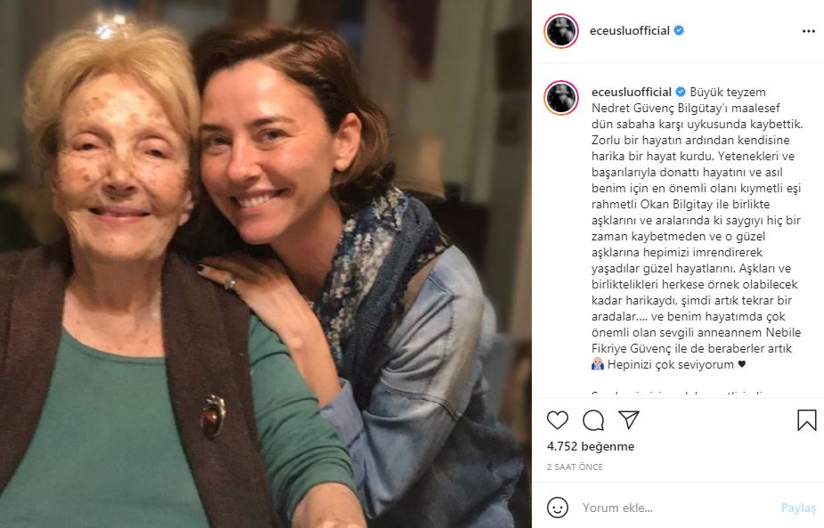 Tiyatronun ve özellikle Yeşilçam sinemasının duayen isimlerinden olan Nedret Güvenç'in vefatı sevenlerini ve ailesini yasa boğdu. Necdet Güvenç'in yeğeni Ece Uslu teyzesinin ardından duygusal bir veda mesajı paylaştı. Sosyal medya hesabından yaptığı paylaşımda Uslu, "Büyük teyzem Nedret Güvenç Bilgütay’ı maalesef dün sabaha karşı uykusunda kaybettik. Zorlu bir hayatın ardından kendisine harika bir hayat kurdu. Yetenekleri ve başarılarıyla donattı hayatını ve asıl benim için en önemli olanı kıymetli eşi rahmetli Okan Bilgitay ile birlikte aşklarını ve aralarında ki saygıyı hiç bir zaman kaybetmeden ve o güzel aşklarına hepimizi imrendirerek yaşadılar güzel hayatlarını. Aşkları ve birliktelikleri herkese örnek olabilecek kadar harikaydı, şimdi artık tekrar bir aradalar…. ve benim hayatımda çok önemli olan sevgili anneannem Nebile Fikriye Güvenç ile de beraberler artık. Hepinizi çok seviyorum" ifadelerini kullandı.