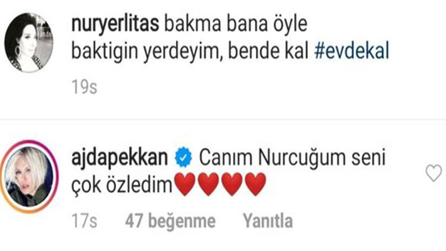 64 yaşında beyin kanserinden hayatını kaybeden usta modacı Nur Yerlitaş sosyal medya hesabı üzerinden son paylaşımını dün yapmış ve bu paylaşımda bir fotoğrafını paylaşarak altına “bakma bana öyle, baktın yerdeyim, ben de kal evdekal” ifadelerini yazıştı. Bu paylaşıma Ajda Pekkan “Nurcuğum seni çok özledim” diye cevap vermişti.