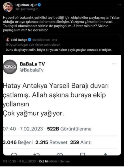 Babala TV hesabından “Hatay Antakya Yarseli Barajı duvarı çatlamış. Allah aşkına buraya ekip yollansın. Çok yağmur yağıyor.” şeklinde yapılan paylaşım sonrası bu paylaşımların deprem bölgesinde depremzede vatandaşlar arasında korku ve paniğe neden olduğu, arama kurtarma çalışmalarında aksamalara neden olduğu dikkate alınarak "BaBala TV" isimli twitter hesabında yapılan paylaşımlar nedeniyle hesap sahibi olduğu tespit edilen Oğuzhan Uğur hakkında "Halkı yanıltıcı bilgiyi alenen yayma" suçundan İstanbul Cumhuriyet Başsavcılığı tarafından re'sen soruşturma başlatıldı.
