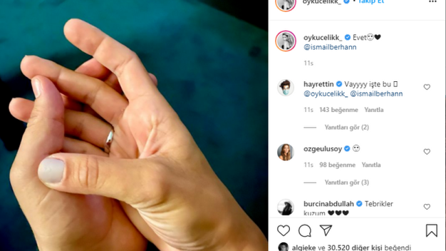 Favori gösterildiği Survivor 2021’e katılmak için Dominik Cumhuriyeti'ne gitmeden önce aşk yaşamaya başladığı İsmail Berhan, yarışmadan elenen Öykü Çelik’e evlilik teklif etti. Yarışmadan elenmenin şokuyla üzülen ancak gelen evlilik teklifiyle sevinen Öykü Çelik mutlu haberi, Instagram'dan paylaştı. Parmağındaki alyansı paylaşan Çelik, resmin altına "Evet" notunu düşerek sevincini sevenleriyle paylaştı. Öykü Çelik – İsmail Berhan çifti önümüzde aylarda nikah masasına oturacak. Kesin tarih belli olur olmaz canlitv platformu olarak takipçilerimize duyuracağız.