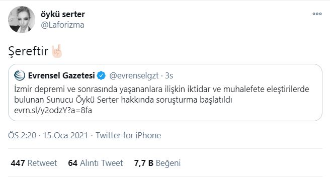 Ünlü sunucu Öykü Serter'in sosyal medya paylaşımları yargıya taşındı. İzmir'de meydana gelen ve birçok insanın öldüğü depremle ilgili eleştirel paylaşımlarda bulunan Serter'e İstanbul Cumhuriyet Başsavcılığı tarafından soruşturma başlatıldı. Öykü Serter hakkında yapılan soruşturma haberleri paylaşarak "Şereftir" notu düştü. Sabah gazetesinin haberine göre Öykü Serter hakkında kimliği belirsiz biri şikayette bulundu ve Emniyet Müdürlüğü tarafından Serter hakkında bir araştırma raporu hazırlanarak İstanbul Cumhuriyet Başsavcılığı'na sunuldu.