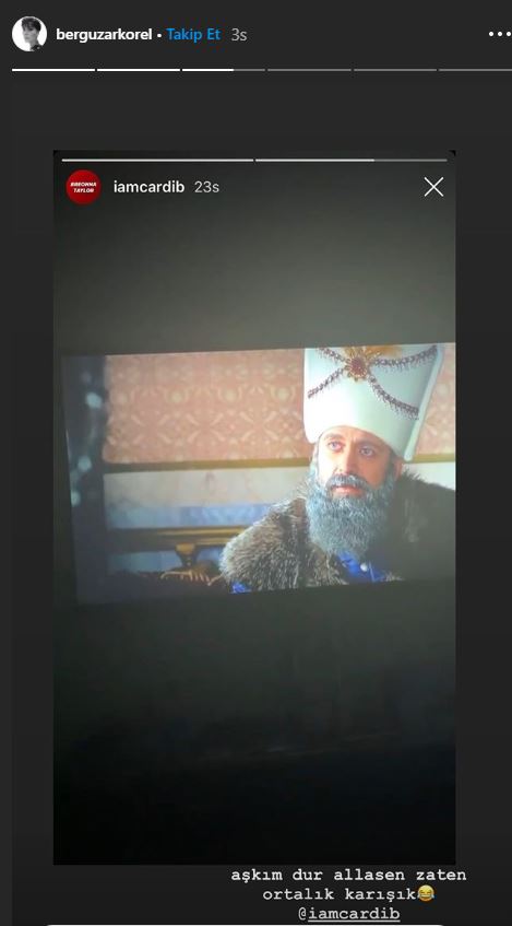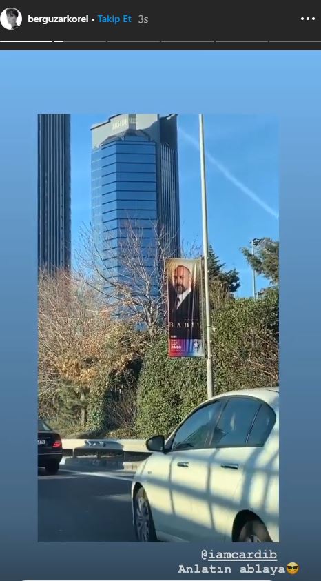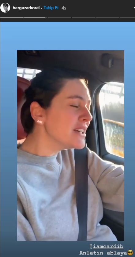 Bergüzar Korel yaptığı paylaşımla Cardi B'ye göndermede bulunurken, 'Anlatın ablaya' notuyla birlikte Cardi B'yi de etiketledi. Bergüzar Korel'in İnstagram hesabından paylaştığı samimi ve eğlenceli hikayesi twitter'da da gündem oldu. Çok sayıda yorum ve like (beğeni) alan paylaşımın ardından ikinci bir hikaye de geldi. Bergüzar Korel, Cardi B'nin paylaşımını da hikayeye ekledi ve üzerine "Aşkım dur allasen. Zaten ortalık karışık" notunu yazdı. Eğlenceli bir paylaşım yapan Korel, Halit Ergenç'e olan aşkını esprili bir imayla yeniden paylaşmış olurken ortaya oldukça renkli görüntüler çıktı.