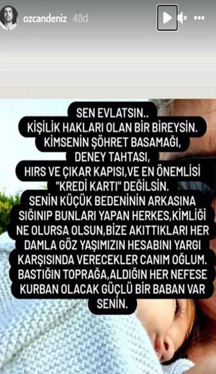 Ünlü şarkıcı ve oyuncu Özcan Deniz ile eski eşi Feyza Aktan arasında devam eden mahkeme bugün de sürdü. Gizlilik kararı olan mahkeme çıkışında ünlü isim Özcan Deniz sosyal medya hesabından bir paylaşımda bulunarak oğluna seslendi. Özcan Deniz paylaşımında “sen evlatsın… Kişilik hakları olan bir bireysin. Kimsenin şöhret basamağı, deney tahtası, hırs ve çıkar kapısı ve en önemlisi kredi kartı değilsin. Senin küçük bedeninin arkasına sığınıp bunları yapan herkes, kimliği ne olursa olsun bize akıttıkları her damla gözyaşımızın hesabını yargı karşısında verecekler canım oğlum. Bastığın toprağa, aldığın nefese kurban olacak güçlü bir baban var senin” ifadelerini kullandı. Bu paylaşım kısa sürede sosyal medyada gündem oldu.