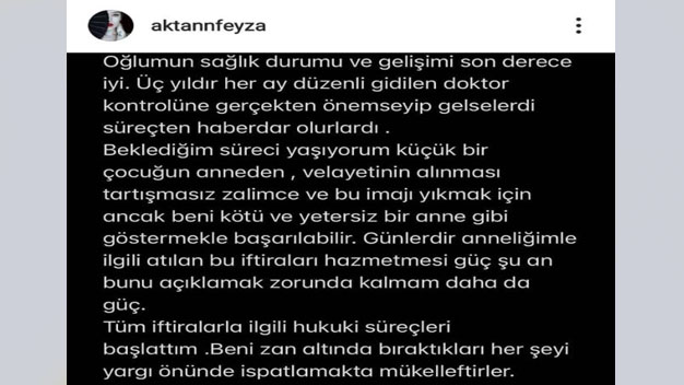 Sibel Semerci’nin kendisi hakkında yaptı açıklamalara sosyal medya hesabından cevap veren Feyza Aktan şu ifadelere yer verdi. “üç yıldır her ay düzenli gidilen doktor kontrolüne gerçekten önemseyip gelselerdi süreçten haberdar olurlardı. Beklediğim süreci yaşıyorum. Küçük bir çocuğun anneden velayetinin alınması tartışmasız zalimce ve bu imajı yıkmak için ancak beni kötü ve yetersiz bir anne gibi göstermekle başarılabilir. Günlerdir anneliğimle ilgili atılan bu iftiraları hazmetmesi güç. Şu an bunu açıklamak zorunda kalmam daha da güç. Tüm iftiralarla ilgili hukuki süreçleri başlattım. Beni zan altında bıraktıkları her şeyi yargı önünde ispatlamakla mükelleftirler” ifadelerini kullandı.