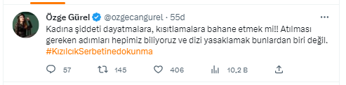 Tartışmalı karadan sonra RTÜk’ün telefonları kilitlenirken twitterde #KızılcıkSerbetinedokunma" trend topic oldu. Dizide gerdek gecesi şiddet gören ve camdan aşağı atılarak öldürülmek istenen Nursema karakteri ve ona hayata veren Ceren Yaldızoğlu Karakoç fenomen hale geldi. Ünlü oyuncuyu arayan binlerce şiddet mağduru kadın, oyuncudan destek istedi. Bunun yanı sıra sosyal medyada açılan #KızılcıkSerbetinedokunma" hastangine destek olan isimlerden biri de ünlü oyuncu Özge Gürel oldu. Gürel yaptığı paylaşımda yasaklamanın çözüm olmadığını şu cümlelerle dile getirdi: "Kadına şiddeti dayatmalara, kısıtlamalara bahane etmek mi!! Atılması gereken adımları hepimiz biliyoruz ve dizi yasaklamak bunlardan biri değil. #KızılcıkSerbetinedokunma"