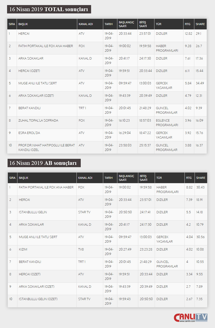 19 NİSAN CUMA REYTİNGLERİ