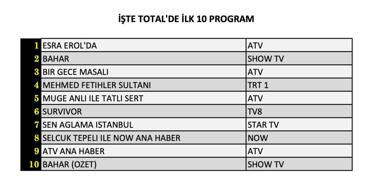 Total izleyici kategorisinde günün en çok izlenen programı Atv'nin gündüz kuşağı programlarından biri olan ‘Esra Erol’da' oldu. Listenin ikinci sırasında Show'da yayınlanan ‘Bahar’ dizisi yer aldı. Atv dizisi ‘Bir Gece Masalı’ üçüncü sırada günü tamamlarken, yine atv'nin gündüz kuşağı programlarından biri olan ‘Müge Anlı ile Tatlı Sert’ listenin beşinci sırasında yer alan yapım oldu. Günün diğer dizisi ‘Sen Ağlama İstanbul’ ise yedinci sırada günü tamamladı.