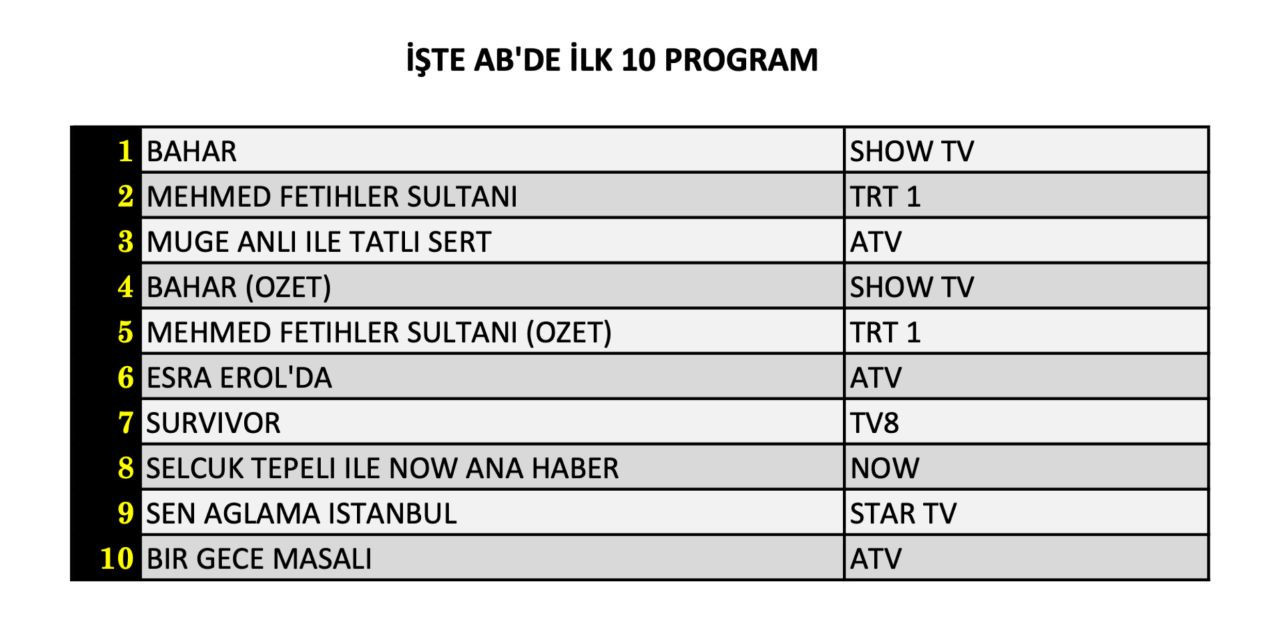 AB izleyici kategorisinde ise birinci sırada yer alan yapım ‘Bahar’ dizisi oldu. Total'de ikinci, AB'de birinci sırada yer alan ‘Bahar’ salı günü en çok izlenen dizi oldu. ‘Mehmed Fetihler Sultanı’ ikinci, ‘Sen Ağlama İstanbul’ sekizinci, ‘Bir Gece Masalı’ ise AB izleyici kategorisinde onuncu sırada yer alabildi.