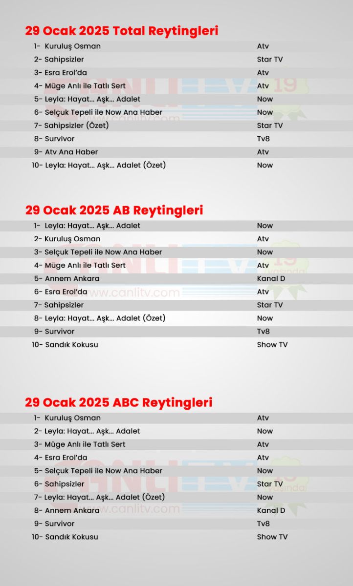 Total izleyici kategorisinde dün en çok izlenen yapım Atv'de yayınlanan ‘Kurtuluş Osman’ dizisi oldu. Star'ın ‘Sahipsizler’ dizisi listenin ikinci sırasında yer alırken, ‘Esra Erol’da' üçüncü, ‘Müge Anlı ile Tatlı Sert’ dördüncü, ‘Leyla: Hayat… Aşk… Adalet’ dizisi ise beşinci sırada yer alan yapımlar oldu. ‘Sandık Kokusu’ ve ‘Annem Ankara’ dizileri ilk 10 sıralamada kendilerine yer bulamadı.