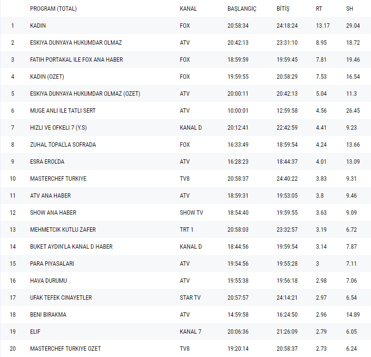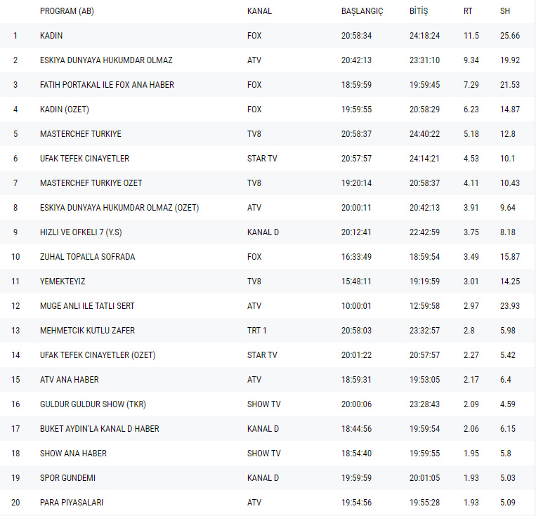 Kadın, Eşkıya Dünyaya Hükümdar Olmaz, Mehmetçik Kutlu Zafer ve Ufak Tefek Cinayetler dizileri ve MasterChef Türkiye yarışmasının ekranlara geldiği 4 Aralık Çarşamba reyting sonuçları belli oldu.