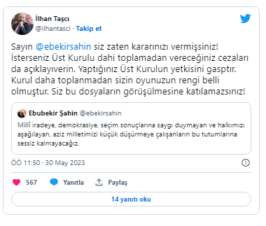 Radyo ve Televizyon Üst Kurulu’na CHP kontenjanından katılan İlhan Taşçı, RTÜK Başkanı Ebubekir Şahin’in bu açıklamalarını alıntılayarak sert çıktı. Şahin’in oyu belli olduğunu belirterek bunun çok sakıncalı olduğunu şu paylaşımıyla duyurdu : “"Siz zaten kararınızı vermişsiniz! İsterseniz Üst Kurul'u dahi toplamadan vereceğiniz cezaları da açıklayıverin. Yaptığınız Üst Kurul'un yetkisini gasptır. Kurul daha toplanmadan sizin oyunuzun rengi belli olmuştur. Siz bu dosyaların görüşülmesine katılamazsınız."
