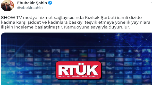 Gold Film tarafından hazırlanan ve Show Tv ekranlarında bu sezon yayınlanmaya başlayan Kızılcık Şerbeti dizisi başarılı yayınıyla reytingini yükseltirken içeriğinde bulunan bazı sahneler ile de dikkatleri ve tepkileri üzerine çekti. Melis Civelek ve Zeynep Gür tarafından kaleme alınan dizinin son bölümünde kadına şiddet içeren sahne ve sahneler ile bu şiddeti teşvik eden görüntülerin yer alması izleyiciyi oldukça gerdi. Sosyal medya ve internet haber sitelerinde geniş şekilde gündeme getirilen ve seyircinin şikayetleri üzerine de en üst noktaya ulaşan tepkiler üzerine RTÜK Başkanı bir açıklama yaptı. RTÜK Başkanı Ebubekir Şahit sosyal medya hesabından yaptığı açıklamada “Show Tv medya hizmet sağlayıcısında Kızılcık Şerbeti isimli dizide kadına şiddet ve kadınlara baskıyı teşvik etmeye yönelik yayınlara ilişkin inceleme başlatılmıştır. Kamuoyuna saygıyla duyurulur” ifadeleri kullanıldı.