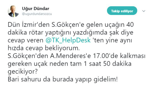 Türk Hava Yolları'na benzer bir tepkiyi de usta gazeteci Uğur Dündar gösterdi. Twitter'dan paylaşım yapan Dündar, "Dün İzmir'den S.Gökçen'e gelen uçağın 40 dakika rötar yaptığını yazdığımda şak diye cevap veren @TK_HelpDesk'ten yine aynı hızda cevap bekliyorum. S.Gökçen'den A.Menderes'e 17.00'de kalkması gereken uçak neden tam 1 saat 50 dakika gecikiyor? Bari sahuru da burada yapıp gidelim!" diye yazdı.