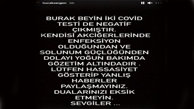 Sadakatsiz dizisinin haluk’u yılların tecrübesi Burak sergen dün gece evinde rahatsızlandı ve ambulansla hastaneye kaldırıldı. Solunum güçlüğü yaşayan usta oyuncunun yapılan covid – 19 testleri negatif çıktı. Usta oyuncunun akciğerlerinde enfeksiyon olduğu açıklandı. Ünlü oyuncu sosyal medya hesabından bir paylaşımda bulunarak duruma açıklık getirdi. Oyuncunun hesabından yapılan açıklamada “Burak bey’in iki covid testi de negatif çıkmıştır. Kendisi akciğerlerinde enfeksiyon olduğundan ve solunum güçlüğünden dolayı yoğun bakımda gözetim altındadır. Lütfen hassasiyet gösterip yanlış haberler paylaşmayınız. Dualarınızı eksik etmeyin. Sevgiler” ifadelerine yer verildi. Burak sergen’in tedavisine halen devam edildiği öğrenilirken durumunun stabil olduğu gelen haberler arasında.