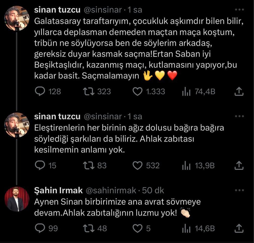 Şahin Irmak, Tuzcu’ya cevaben “Aynen Sinan birbirimize ana avrat sövmeye devam. Ahlak zabıtalığının lüzumu yok!” diyerek geri adım atmayacağının işaretini verdi. Özür dilediği halde hala üst perdeden kendisine cevap verilmesine içerleyen Saban “20 milyon kişinin aynı anda küfür ettiği derbilerde hayatında hiç küfür etmemiş gibi YARGI DAĞITANlar!!!! Böyle bir şeyden PRİM ELDE ETMEye çalışıp en büyük “y.v..lık”ı yapmaktan BAŞKA bir şey yapmıyorsunuz:):):)”
