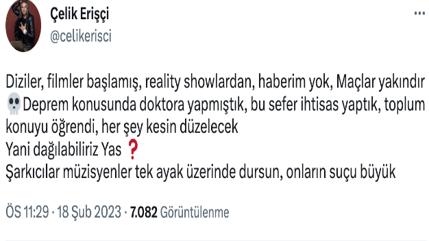 Kahramanmaraş merkezli 10 ilde büyük yıkıma sebep olan ve binlerce insanın hayatını kaybetmesine, yaralanmasına ve evlerini kaybetmesine sebep olan büyük deprem sonrası yardım çalışmaları tüm ülkede yoğun bir şekilde devam ediyor. Pek çok sektörün el ele vererek yardımlarda bulunduğu depremzedeler için ilan edilen ulusal yas aynı zamanda pek çok sektörün çalışmalarını da etkiledi. Özelikle televizyon ve eğlence sektörünün çalışmalarına büyük etki eden deprem sonrası bu sektörde çalışanlar işlerine ara vermek zorunda kaldılar. Televizyon ekranlarında yayınlanan diziler yeni bölümlerini yayınlamazken çekimler belli bir süre durdu, reklamlar televizyonlarda yayınlanmadı ve tüm ülke genelinde konserler ertelendi. Bu durum birçok ünlü isim tarafından desteklendi. Ancak ilerleyen zamanlarda değişik sektörlerde deprem dolayısıyla verilen ara bitti ve çalışmalar yeniden başladı. Tam da bu noktada şarkıcı Çelik’ten dikkat çekici bir paylaşım geldi.