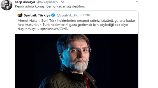 Koronavirüs sebbeiyle ülkemizde yaşananlar ve sağlık sektöründe çalışan binlerce kişinin özverili gayreti ve çalışması her kesim tarafından tartışmasız takdir görüyor. Sağlıklarını hiçe sayarak hastaları tedavi etmek için canhıraş bir şekilde çalışan sağlık ordusu bu çabalarının karşılığını da haklı olarak takdir edilerek görüyor. Gazeteci Ahmet Hakan’da sosyal medya üzerinden bir paylaşımda bulunarak bu çabayı övdü. Ancak Ahmet Hakan’ın verdiği örnek tepki çekti. Hakan “Atatürk’ün herkes tarafından bilinen “Beni Türk hekimlerine Emanet Ediniz” sözü için şu ana kadar hep Atatürk’ün Türk Hekimlerini gaza getirmek için söylediği söz diye düşünmüştük.” şeklindeki ifadeleri sosyal medya kullanıcıları tarafından yoğun bir şekilde eleştirildi. Bu eleştirileri yapanlardan biri de oyuncu Sarp Akkaya oldu. Akkaya Ahmet hakan’ın bu paylaşımını sert bir şekilde eleştirerek “kendi adına konuş. Ben o kadar sığ değilim.” İfadelerini kullandı. Akkaya’nın bu cevabı bir anda sosyal medya kullanıcısı binlerce kişiden beğeni aldı. Bu tepki karşısında ise Ahmet hakan şimdilik sessiz kalmayı tercih ediyor.