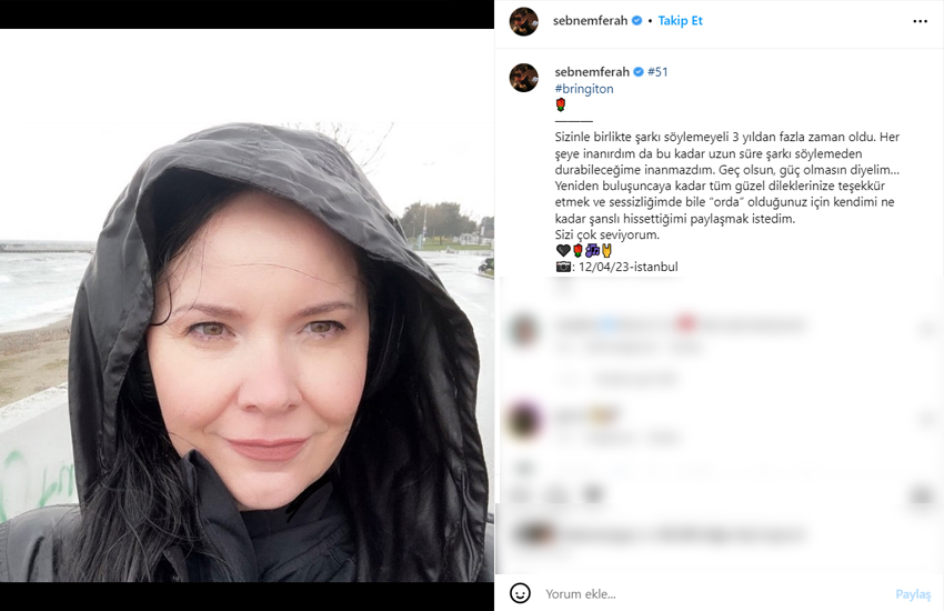 Rock müziğinin efsane isimlerinden Şebnem Ferah üç yıldan beri sahnelere çıkmıyor, iki yıldan fazladır sosyal medya paylaşımları yapmıyordu. 51. Yaşına giren ünlü şarkıcı “Sizinle birlikte şarkı söylemeyeli 3 yıldan fazla zaman oldu. Her şeye inanırdım da bu kadar uzun süre şarkı söylemeden durabileceğime inanmazdım. Geç olsun, güç olmasın diyelim… Yeniden buluşuncaya kadar tüm güzel dileklerinize teşekkür etmek ve sessizliğimde bile “orda” olduğunuz için kendimi ne kadar şanslı hissettiğimi paylaşmak istedim. Sizi çok seviyorum.” diyerek uzun zamandır kendisinden haber almayan takipçilerini bilgilendirdi.