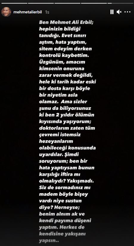 Seda Sayan gündeme bomba gibi düşen sözlerinin ardından yaptığı paylaşımları sildi. Bu sözlerden sonra Mehmet Ali Erbil de bir açıklama yayınladı. Mehmet Ali Erbil açıklamasında "Ben Mehmet Ali Erbil; hepinizin bildiği tanıdığı. Evet sınırı aştım, hata yaptım, sitem edeyim derken kontolü kaybettim. Üzgünüm, amacım kimsenin onuruna zarar vermek değildi. Hele ki tarih kadar eski bir dosta karşı böyle bir niyetim asla olamaz. Ama sizler şunu da biliyorsunuz ki ben 2 yıldır ölümün kıyısında yaşıyorum; doktorlarım zaten tüm çevremi istemsiz hezeyanları olabileceğim konusunda uyardılar. Şimdi soruyorum; ben bir hata yaptıysam bunun karşılığı iftira mı olmalıydı? Yakışmadı. Siz de sormadınız mı madem böyle bir şey vardı niye sustun diye? Her neyse; benim alnım ak ve kendi payıma düşeni yaptım. Herkes de kendisine yakışanı yapsın" ifadelerini kullandı. Magazin dünyasına bomba gibi düşen iddiların sonuçları merak ediliyor.