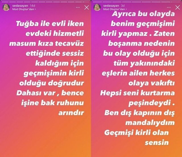 Seda Sayan ile Mehmet Ali Erbil arasında yaşananlar itirafa dönüştü. Tartışmanın devam etmesi üzerine Seda Sayan'dan dehşete düşüren paylaşımlar geldi. Seda Sayan Mehmet Ali Erbil'in eşi Tuğba ile evliyken evdeki hizmetli kıza tecavüz ettiğini söyledi. Seda Sayan'ın paylaşımlarında, "Tuğba ile evliyken evdeki hizmetli masum kıza tecavüz ettiğinde sessiz kaldığım için geçmişimin kirli olduğu doğrudur. Dahası var bence işine bak ruhunu arındır. Ayrıca bu olayda benim geçmişimi kirli yapmaz. Zaten boşanma nedenin bu olay olduğu için tüm yakınındaki eşlerin ailen herkes olaya vakıftı. Hepsi seni kurtarma peşindeydi. Ben dış kapının dış mandalıydım. Geçmişi kirli olan sensin. Bence işine bak, ruhunu arındır. Dua et çocuklarının hatırına. Allah'tan af dile benden değil" ifadelerine yer verdi.