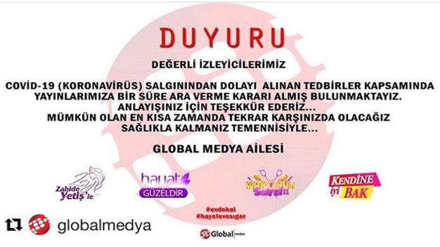 Show Tv’ye hazırladığı programları süresiz olarak durduran Global Medya’nın sosyal medya hesabından yaptığı paylaşımda şu ifadelere yer verildi. “Değerli İzleyicilerimiz! Covid 19 (Koronavirüs) salgınından dolayı alınan tedbirler kapsamında yayınlarımıza bir süre ara verme kararı almış bulunmaktayız. Anlayışınız için teşekkür ederiz. Mümkün olan en kısa zamanda tekrar karşınızda olacağız. Sağlıkla kalmanız temennisiyle… Global Medya Ailesi.” Böylece Global Medya Show Tv’ye hazırlamış olduğu dört yayının çekimlerini koronavirüs salgını sebebiyle durdurmuş oldu. Kanalın gündüz kuşağının nasıl bir yayın akışıyla şekilleneceği ise şimdiden merak edilmeye başlandı. Konuyla ilgili gelişmeleri sizlere duyurmaya devam edeceğiz.