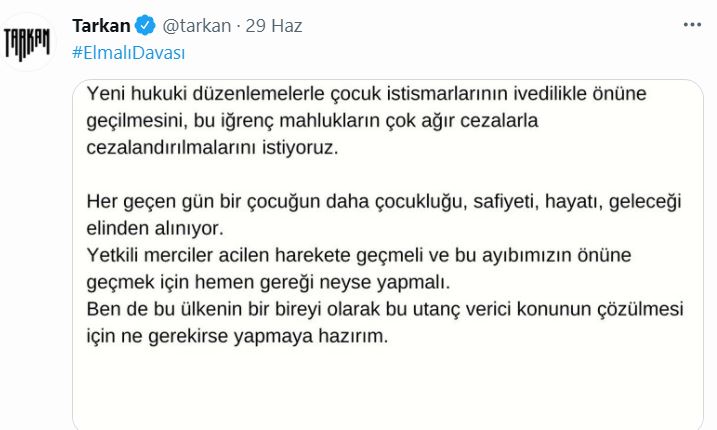 Türkiye'yi sarsan iki çocuğa yönelik cinsel istismar davasına tepkiler çığ gibi büyüyor. Antalya'da iki kardeşin yaşadığı kabus tüm ülkeye çöktü. Elmalı mahkemesinin verdiği karar ise vicdanları yaraladı. Komuoyunda Elmalı davası olarak simgeleşen davada iki çocuğa istismarda bulunan anne ve üvey baba serbest bırakıldı. Davanın avukatları başta olmak üzere birçok kurum ve kuruluş karara tepki gösterdi. Yaşananlara tepki gösteren isimler arasında ünlü şarkıcı Tarkan da vardı. Tarkan, "Bugün hepimizin kanını donduran Elmalı Davası konusu beni de çok sarstı. Kendime gelemiyorum" ifadelerini kullandı.