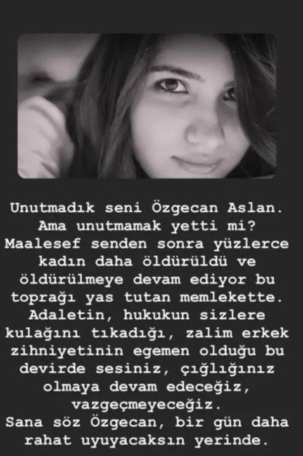 Ünlü isimler zaman zaman toplumsal duyarlılığa değinirler ve bu konularda kanaatlerini ve düşüncelerini paylaşırlar. Toplum tarafından bilinen ve önemsenen olaylarla ilgili açıklamalarda bulunurlar. Ünlü şarkıcı Tarkan’da bugün sosyal medya hesabından bir paylaşımda bulundu ve bundan 7 sene önce yaşanan ve tüm Türkiye tarafından derin bir üzüntüyle karşılanan Özgecan Aslan cinayetine değindi. 7 yıl önce yaşandığında tam bir infiale neden olan Özgecen aslan cinayetine değinen ve bu olayın derin üzüntüsünü yaşayan Tarkan paylaşımında bu olayın ve bunun gibi olayların devam ettiğini ve bitmediğini belirtti. Bu konulardaki duyarlılığı ile bilinen ünlü ismin paylaşımı internet haber sitelerinde ve magazin basınında yer alırken takipçileri tarafından binlerce beğeniyle karşılandı.