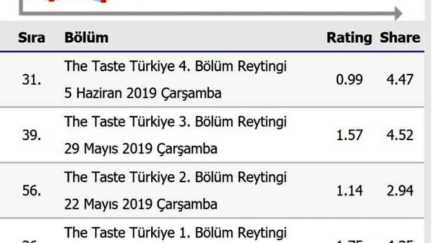 15 Mayıs 2019 Çarşamba günü ekranlardaki yerini alan The Taste Türkiye ne yazık ki düşük reyting alınca gün değiştirmek zorunda kaldı. Çarşamba akşamları güçlü rakipleri karşısında tutunamayan The Taste Türkiye artık pazartesi akşamları şansını deneyecek. İlk 4 bölümde çok farklı reytingler alarak tutarsız bir yaklaşımsewr4gileyen program, bize göre tahminen 13 bölüm yayında olacak. Ne zaman final yapacağı açıklanmasa da ağustos başında ya sezon finali yapacak ya da tamamen yayından kaldırılacak.
