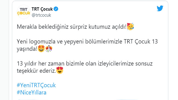 Tam 13 yıl önce büyük heyecan ve beklentilerle ve yüksek ideallerle kurulan ve yayın hayatına başlayan TRT Çocuk kanalı sektörde kendi alanında en önde gelen kanalların başında geliyor. Hazırladığı yapımlarla çocukların sevgilisi haline gelen ve yıllardır tüm ülkedeki evlerin değişmez kanalı haline gelen TRT Çocuk bugün 13. Yaş gününü kutladı ve bu heyecanı hem seyircisi olan çocuklarla hem de sektördeki bu işin erbabı olan kişilerle kutladı. Sosyal medya hesabından yaptığı paylaşımla hem çocuklara yönelik sürprizlerinin devam edeceğini hem de 13. yaşını kutlayan kanal aynı zamanda uzun yıllardır değişmeyen ve artık çocukların görür görmez tanıdığını logosunu da değiştirdi. Kanalın yeni logosu çocuklar tarafından hemen beğenildi ve sevildi.