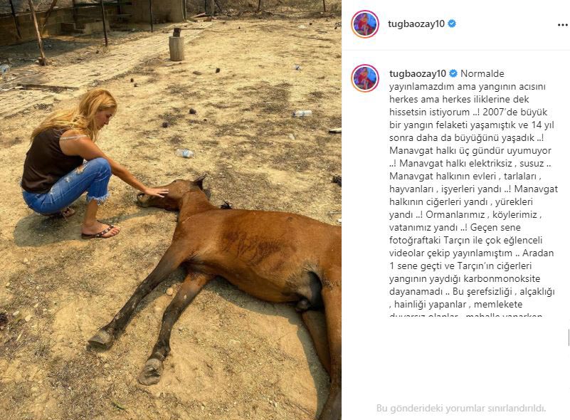 Yaşananlardan maddi ve manevi olarak çok etkilenen Tuğba Özay yangının kontrol altına alınmasının ardından evinin bulunduğu bölgeye gitti. Sosyal medya hesabından Manavgat'taki durumu aktarmaya devam eden Tuğba Özay ölen atıyla birlikte bir fotoğraf paylaştı. Paylaşımında Manavgat'taki insanların neler yaşadığını anlatan Özay çok sert ifadelerle sitem etti. Tuğba Özay geçen yıl üzerinde pozlar verdiği atı Tarçın'ın ciğerlerinin yangından çıkan karbonmonokside dayanamadığını belirtti.
