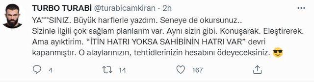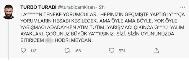 Turabi Çamkıran, ‘’Ulan teneke yorumcular!’’ sözleriyle başladığı paylaşımını, ‘’Sizin oyununuz da bitireceğim. Hodri meydan!’’ cümleleriyle sonlandırdı.