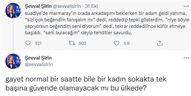 Yaptığı paylaşım sonrasında büyük destek gören Şevval Şirin, daha sonra instagram hesabında, 'Bu olayı Twitter'da yazdığımda böyle bir destekle karşılaşacağımı hiç düşünmemiştim. Teşekkür ederim. Destekleyenler kadar yaşanan olaya rağmen beni suçlayan yüzlerce insan olması da bu ülkenin özeti. İstediğimiz saatte, istediğimiz yerde özgürce, korkusuzca olabileceğimiz günlere de kavuşuruz elbet.' dedi.