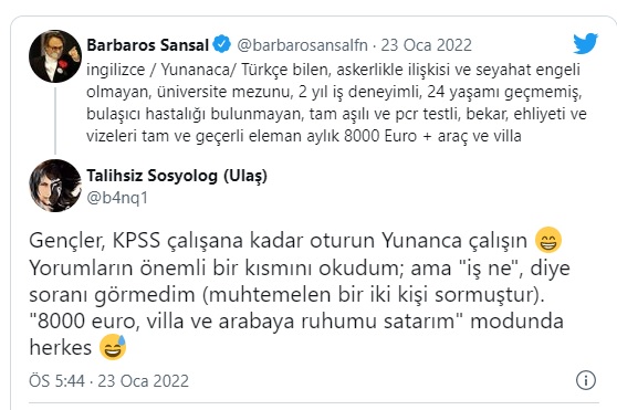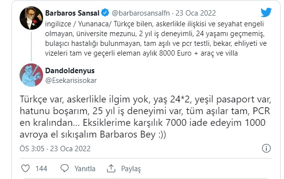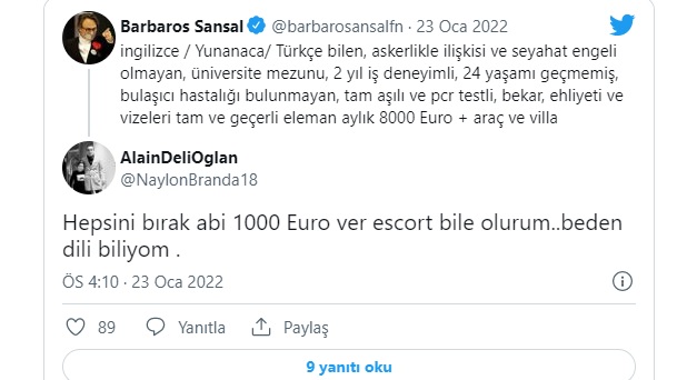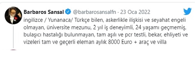 Sosyal medya hesabından iş ilanı paylaşma furyasına katılan bir diğer isimde ünlü modacı Barbaros Şansal oldu. Twitter hesabı üzerinden bir ilan paylaştı. 8 bin Euro maaş vereceğini açıklayan Şansal’ın ilanı takipçileri tarafından epey tiye alındı.