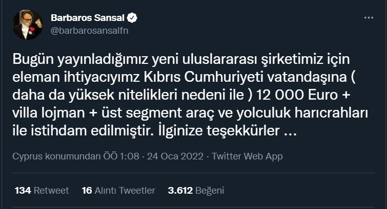Bugün yayınladığımız yeni uluslararası şirketimiz için eleman ihtiyacıyımz Kıbrıs Cumhuriyeti vatandaşına (daha da yüksek nitelikleri nedeni ile) 12.000 Euro + villa lojman + üst segment araç ve yolculuk harcırahları ile istihdam edilmiştir. İlginize teşekkürler …