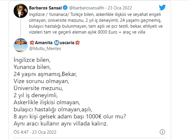 İngilizce / Yunanaca/ Türkçe bilen, askerlikle ilişkisi ve seyahat engeli olmayan, üniversite mezunu, 2 yıl iş deneyimli, 24 yaşamı geçmemiş, bulaşıcı hastalığı bulunmayan, tam aşılı ve pcr testli, bekar, ehliyeti ve vizeleri tam ve geçerli eleman aylık 8000 Euro + araç ve villa