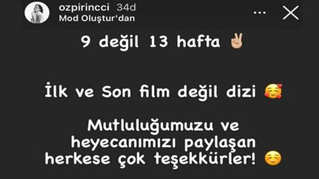 Magazin ve ünlüler dünyasında son zamanlarda evlenenler, çocuk sahibi olanlar ve bebek bekleyenler oldukça artmış durumda. Bu durum ünlüler dünyasında bir sevinç ve coşku oluştursa da ünlülerin sevenlerini ve takipçilerini de fazlasıyla mutlu ediyor. Sinema ve dizi dünyasının başarılı ve güzel oyuncularından biri olan ünlü isim Özge Özpirinçci’den bugün sürpriz bir haber magazin basınında ve sosyal medyada geniş bir ilgiyle karşılandı. Bir anda magazin basını ve sosyal medyada gündem olan habere göre ünlü oyuncu Özge Özpirinçci’nin hamile olduğu iddiaları yer almıştı. Bu iddialar üzerine ünlü oyuncu sosyal medya hesabından bir paylaşım yaparak hamile olduğu iddialarının gerçek olduğunu sevenlerine duyurdu. Bu haberin ardından pek çok seveni ünlü ismi tebrik mesajlarına boğdu. Ünlü ismin 13 haftalık hamile olduğu belirtildi.