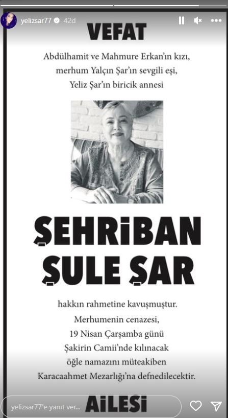 Yaprak Dökümü, İşler Güçler, Yasak Elma, Kalp Gözü, Öğrenci İşleri, Düriye’nin Güğümleri, Çocukluk Günleri gibi birçok önemli projede yer alan ünlü oyuncu Yeliz Şar annesi Şehriban Şule Şar’ın hayatını kaybettiğini instagram hesabından duyurdu. Yeliz Şar’ın bu üzüntülü sosyal medya paylaşımının altına başsağlığı ve taziye mesajları yağdı.