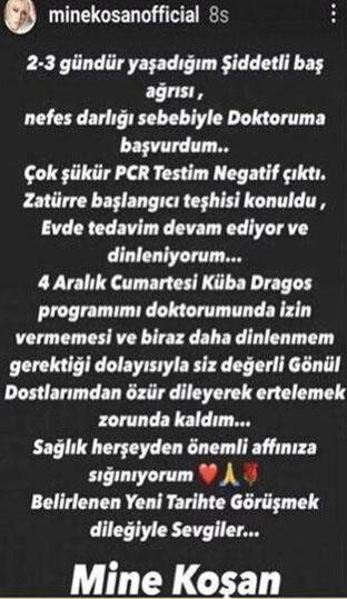 Ünlü şarkıcı Mine Koşan son zamanlarda aşırı baş ağrısı ve nefes darlığı çekmeye başladı. 4 Aralıkta sevenleriyle buluşacak olan ve konsere hazırlanan Mine Koşan yaşadığı sorunlar sebebiyle doktora başvurdu. Yapılan kontroller sonunda ünlü isme zatürre başlangıcı teşhisi kondu. Ünlü isim sosyal medya hesabından yaptığı paylaşımda “2 – 3 gündür yaşadığım şiddetli baş ağrısı, nefes darlığı nedeniyle doktoruma başvurdum. Çok şükür PCR testim negatif çıktı. Zatürre başlangıcı teşhisi konuldu. Evde tedavim devam ediyor ve dinleniyorum. 4 Aralık Cumartesi günkü programımı doktorumun da izin vermemesi ve biraz daha dinlenmem gerektiği dolayısıyla siz kıymetli gönül dostlarımdan özür dileyerek ertelemek mecburiyetinde kaldım. Sağlık her şeyden mühim. Affınıza sığınıyorum. Tespit edilen yeni tarihte görüşmek dileğiyle” ifadelerini kullandı.