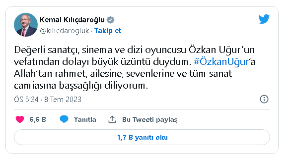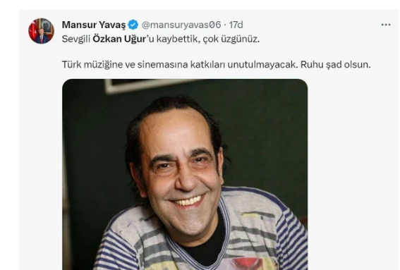 İçişleri Bakanı Ali Yerlikaya da "Türk Müziği'nin unutulmaz gruplarından MFÖ'nün solisti, canlandırdığı karakterlerle hafızalarımıza kazınan kıymetli sanatçımız Özkan Uğur'a Allah'tan rahmet diliyorum. Mekânı cennet olsun. Ailesinin, sevenlerinin ve sanat camiasının başı sağ olsun." Dedi.