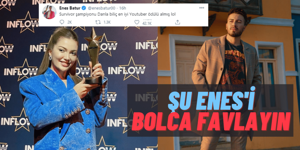 Halk oylamasıyla belirlenen 'En İyi YouTube Influencer’ı ödülüne 2020 yılı için Danla Bilic, layık görüldü. INFLOW Awards’ 20 Ödül gecesine damga vuran Danla Bilic aldığı ödülü kendi sosyal medya hesabından takipçileriyle paylaştı. Ödül gecesinde ayrıca En İyi Instagram Influencer’ı ödülünü Damla Altun, En İyi Twitch Influencer’ı ödülünü Kendine Müzisyen ve En İyi Tiktok Influencer’ı ödülünü Cemre Solmaz aldı.buraya kadar her şey normal. Ertesi gün ödğl törenini diline dolayan Enes Batur, yaptığı paylaşımın altına 'Survivor şampiyonu Danla Biliç En İyi Youtuber ödülü almış lol' notunu düştü.