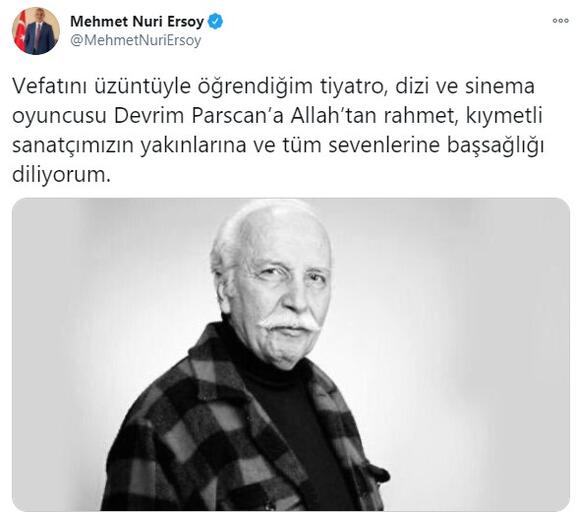 Usta Oyuncu Devrim Parscan'ın vefatı üzerine Kültür ve Turizm Bakanı Mehmet Nuri Ersoy da bir sosyal medya paylaşımı yaptı. Başsağlığı dileyen Bakan Ersoy, " Vefatını üzüntüyle öğrendiğim tiyatro, dizi ve sinema oyuncusu Devrim Parscan’a Allah’tan rahmet, kıymetli sanatçımızın yakınlarına ve tüm sevenlerine başsağlığı diliyorum" ifadelerini kullandı.