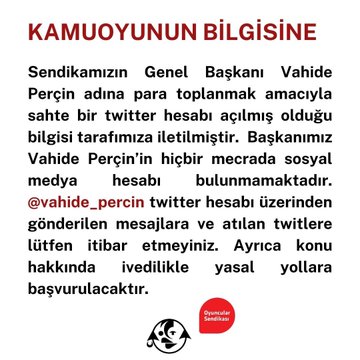 Vahide Perçin’ in başkanlığını yaptığı Oyuncular Sendikası da bir açıklama yaparak sahte hesaptan gelen mesajların dikkate alınmaması gerektiğini belirterek :” Kamuoyuna!… Sendikamızın Genel Başkanı Vahide Perçin adına para toplanmak amacıyla sahte bir twitter hesabı açılmış olduğu bilgisi tarafımıza iletilmiştir. Başkanımız Vahide Perçin’in hiçbir mecrada sosyal medya hesabı bulunmamaktadır. @vahide_percin twitter hesabı üzerinden gönderilen mesajlara ve atılan tweet’lere lütfen itibar etmeyiniz. Ayrıca konu hakkında ivedilikle yasal yollara başvurulacaktır.” şeklinde twitter kullanıcılarını uyardı.