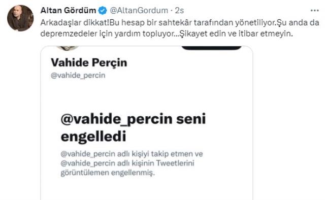 Açılan hesabı fark ederek takipçileri twitter hesabından uyaran sanatçının eski eşi ünlü oyuncu Altan Gördüm :” Arkadaşlar dikkat! Bu hesap bir sahtekar tarafından yönetiliyor. Şu anda da depremzedeler için yardım topluyor…Şikayet edin ve itibar etmeyin.” İfadelerini kullandı.