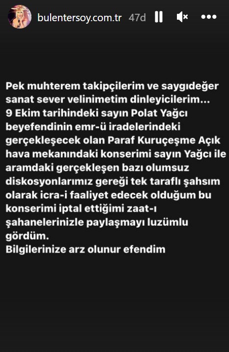 İlerleyen yaşına rağmen konser maratonuna hız kesmeden devam eden Bülent Ersoy, 9 Ekim'de İstanbul'da büyük bir konser vermeye hazırlanıyordu. Ancak konsere bir hafta kala sahneye çıkacak olan Bülent Ersoy, sosyal medya hesabı Instagram’dan bir açıklama yayınladı ve konseri tek taraflı iptal ettiğini duyurdu. Yapımcısı Polat Yağcı ile konser konusunda anlaşmazlıklar yaşadığını söyleyen Bülent Ersoy kinayeli bir şekilde açıklama yaptı. İşte o kimilerine dalga geçtiği izlenimi veren tuhaf açıklama: "Pek muhterem takipçilerim ve saygıdeğer sanatsever velinimetim dinleyicilerim... 9 Ekim tarihindeki Sayın Polat Yağcı beyefendinin emr-ü iradelerinde gerçekleşecek olan konserimi Sayın Yağcı ile aramdaki gerçekleşen bazı olumsuz diskosyonlarımız gereği tek taraflı şahsım olarak icra-i faaliyet edecek olduğum bu konserimi iptal ettiğimi zaat-ı şahanelerinizle paylaşmayı lüzumlu gördüm"