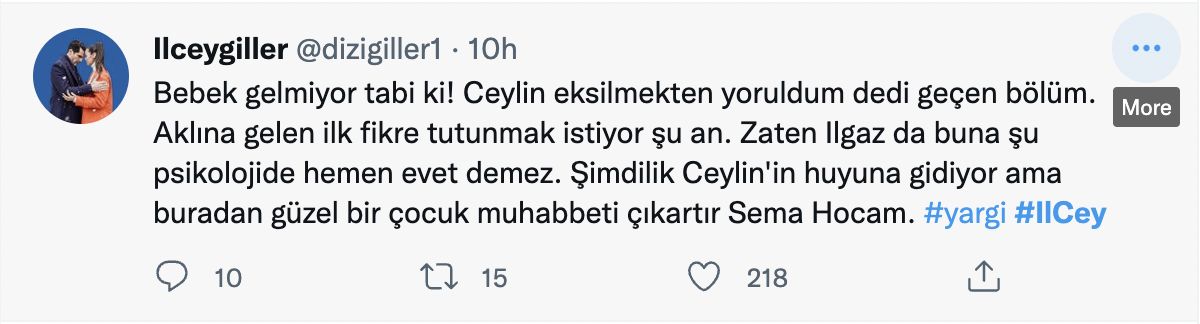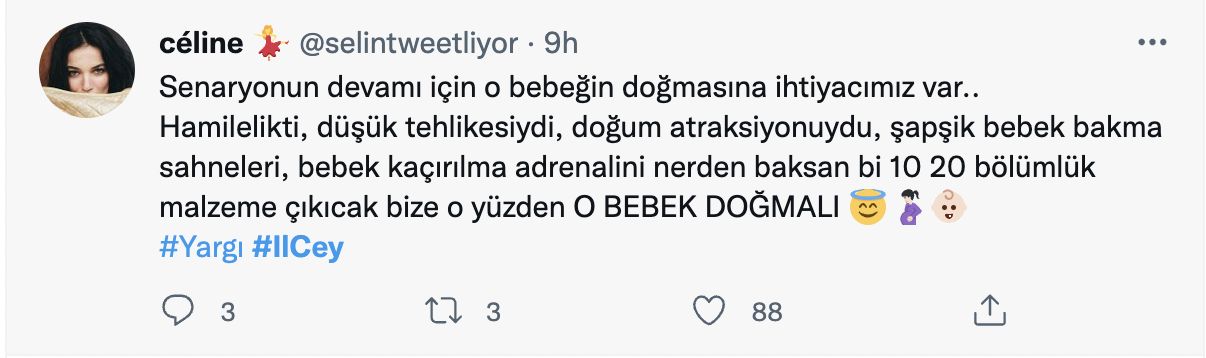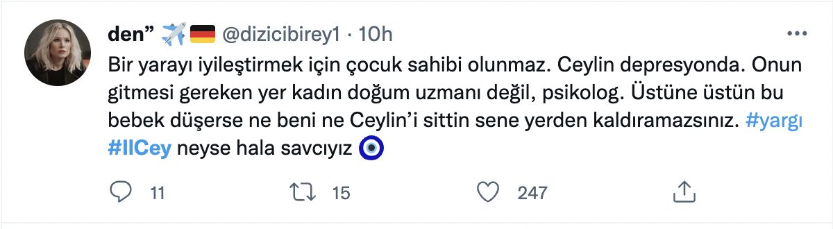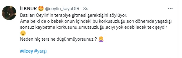 ‘’Bir yarayı iyileştirmek için çocuk sahibi olunmaz. Ceylin depresyonda. Onun gitmesi gereken yer kadın doğum uzmanı değil, psikolog. Üstüne üstün bu bebek düşerse ne beni ne Ceylin’i sittin sene yerden kaldıramazsınız. #yargı #IlCey neyse hala savcıyız’’